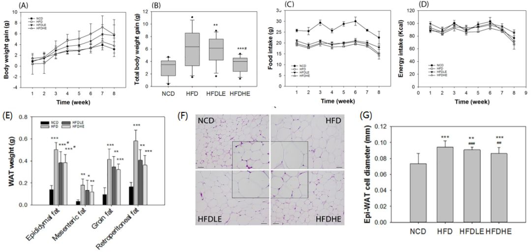 3.?分組方式①正常膳食組(NCD)、②高脂膳食組(HFD)、③高脂+低藻(10 mg/kg/d)膳食組(HFD-LE)、④高脂+高藻(50 mg/kg/d)膳食組(HFD-HE)。