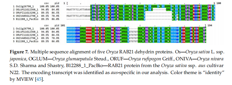 舉個(gè)例子,在高溫和干旱雙重脅迫下顯著上調(diào)的基因B12288。它在japonica和indica中均有同源基因RAB21,這個(gè)基因受干旱的誘導(dǎo),其編碼的蛋白屬于LEA脫氫蛋白家族。與水稻其它脫氫蛋白進(jìn)行多序列比對(duì)研究(圖7),N22實(shí)際上的基因與野生稻、O. sativa ssp. japonica中其它4種脫氫酶的親緣關(guān)系密切。序列覆蓋率為89.5%,序列同源性86.0%,其中包含脫氫酶高度保守的重復(fù)區(qū)。相比japonica蛋白,N22蛋白序列與野生稻更接近。