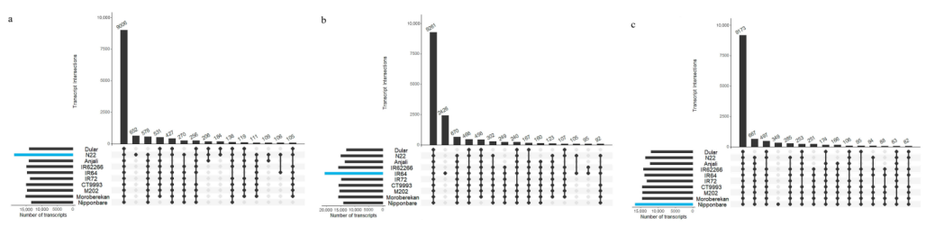 為了鑒定品種特異性轉(zhuǎn)錄本,以N22、IR64和Nipponbare三個(gè)品種的轉(zhuǎn)錄本作為blast比對(duì)庫(kù),其它9個(gè)品種與其進(jìn)行比對(duì)(圖6)。識(shí)別到N22特有轉(zhuǎn)錄本652個(gè),IR64特有轉(zhuǎn)錄本2426個(gè),Nipponbare特有轉(zhuǎn)錄本349個(gè)。