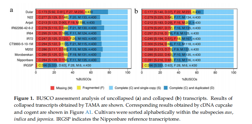 基于植物中430個(gè)高度保守的同源蛋白利用BUSCO軟件對(duì)TAMA算法去冗余前后的HQ進(jìn)行完整性評(píng)估(圖一),由于取樣不完全,缺失了54%~27%的重要蛋白,其中Nipponbare參考基因組(IRGSP)只缺失了6種。cDNA cupcake和TAMA的結(jié)果相似,而對(duì)于cogent,超過(guò)50%的蛋白缺失,最有可能的原因是轉(zhuǎn)錄本沒(méi)有回比到重建的基因組。