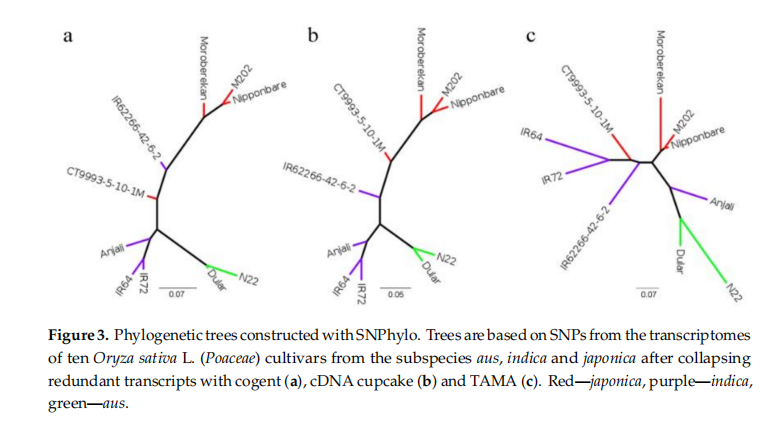 來(lái)自同一亞種的不同品種親緣關(guān)系更近,我們使用系統(tǒng)發(fā)育樹(shù)評(píng)估亞種之間的遺傳距離。利用去冗余后的轉(zhuǎn)錄本序列基于Nipponbare參考基因組識(shí)別SNPs,使用SNPhylo繪制進(jìn)化樹(shù)(圖3)。SNPhylo提取高質(zhì)量并且具有代表性的SNPs進(jìn)行后續(xù)分析,cDNA cupcake算法大約30000個(gè)SNPs,cogent算法大約23200個(gè)SNPs,TAMA算法大約16000個(gè)SNPs。三種方法中,同一亞種的不同品種聚類(lèi)在了一起,cDNA cupcake算法和cogent的聚類(lèi)結(jié)果更相似。三種方法均能將aus與另外兩個(gè)亞種區(qū)分開(kāi),但cogent和TAMA對(duì)indica和japonica種間的區(qū)分不如cDNA cupcake明顯。