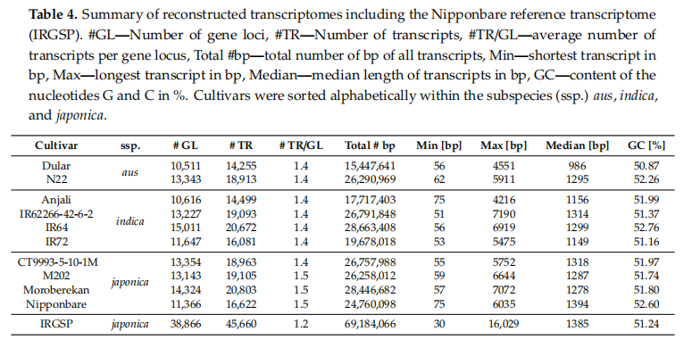 在過(guò)去的幾年里,RNA測(cè)序(特別是基于illumina的短序列RNA-seq)已經(jīng)成為分析轉(zhuǎn)錄組的有力工具,用來(lái)識(shí)別在非脅迫控制和各種環(huán)境脅迫條件下差異表達(dá)的基因。然而,需要基于參考基因組或轉(zhuǎn)錄組序列對(duì)RNA-seq數(shù)據(jù)進(jìn)行比對(duì)和注釋來(lái)確定轉(zhuǎn)錄水平。在水稻中,參考基因組決定了可以鑒別的差異表達(dá)基因和轉(zhuǎn)錄本亞型。顯然,參考基因組/轉(zhuǎn)錄組中沒(méi)有的基因的表達(dá)信息在分析過(guò)程中會(huì)丟失。這在研究耐脅迫的外來(lái)品種、陸地品種或野生稻種時(shí)尤其相關(guān),因?yàn)樗鼈兛赡芎袇⒖计贩NNipponbare不存在的耐受基因。這將嚴(yán)重限制識(shí)別支持作物改良計(jì)劃的新候選基因的可能性。