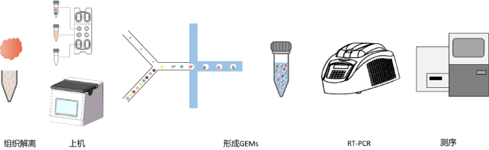 儀器運行后,通過控制流速的方法,使得在“Y型”接口處,一個膠珠會吸附單個細(xì)胞及逆轉(zhuǎn)錄預(yù)混液一起向右流動。到了“十字”接口處,它們與油相接觸后,每一個油滴中會包裹著一個膠珠與一個細(xì)胞,也就是“油包水”(GEMs)結(jié)構(gòu)。