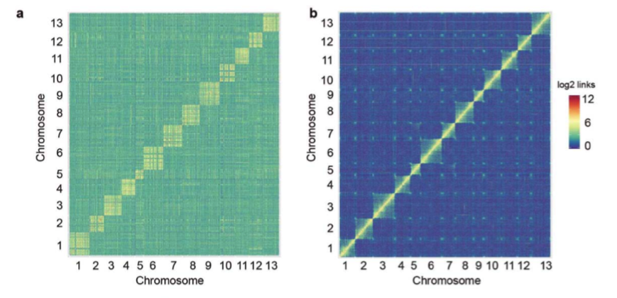 a. Hi-C數(shù)據(jù)與亞洲棉原基因組比對(duì);b. Hi-C數(shù)據(jù)與亞洲棉更新基因組比對(duì)