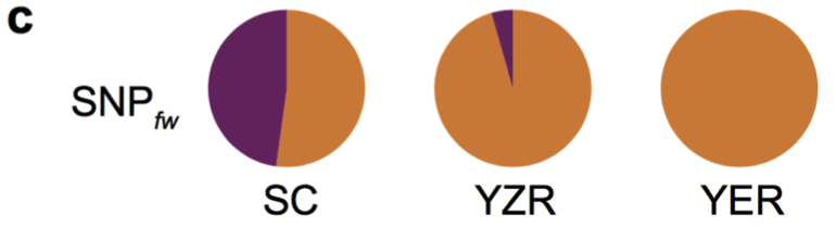 人工選擇在農(nóng)作物的馴化和遷徙的過(guò)程中具有重要的作用。群體結(jié)構(gòu)分析顯示當(dāng)K=4時(shí),YER與SC和YZR明顯不同(圖4 b,K=4)。通過(guò)兩兩群體間(SC vs. YZR, SC vs. YER, YZR vs. YER)的選擇性清除分析(FST)鑒定出了分別覆蓋到3,162,2,879和3,308個(gè)基因上的59,53和51個(gè)顯著遺傳分化的區(qū)域。SC和YZR之間的21個(gè)分化的區(qū)域(約43.5 Mb 含有915個(gè)基因)在群體SC和YER之間是保守的(圖7 a)。