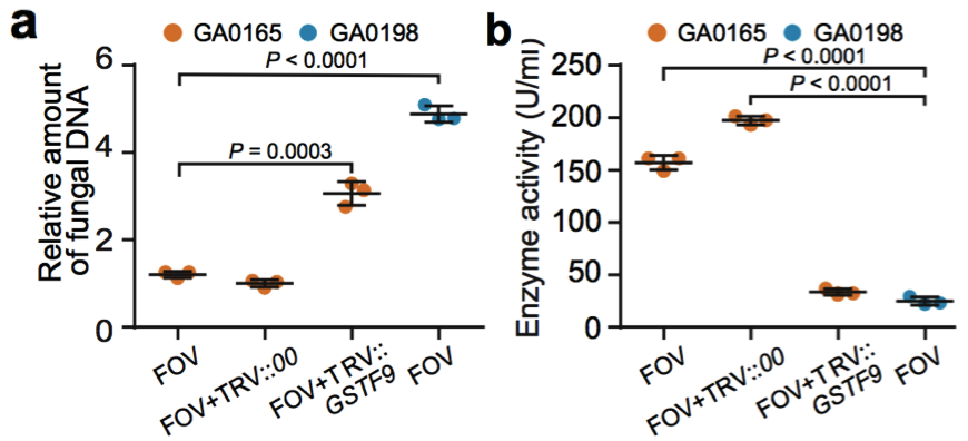 圖16 a GA00198, GA0165, TRV::00和TRV:GSTF9植株中FOV DNA的相對(duì)含量測(cè)定;b GA00198, GA0165, TRV::00和TRV:GSTF9植株中GST酶活性測(cè)定;