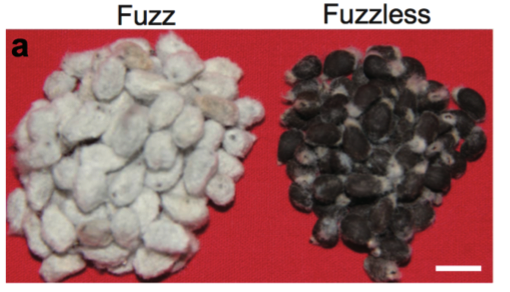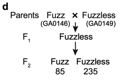 (3)與棉絨相關(guān)基因的研究 棉絨是覆蓋種子表面的短纖維。研究中選擇了亞洲棉種質(zhì)中的158份有絨毛和57份無(wú)絨毛材料進(jìn)行GWAS關(guān)聯(lián)分析,最終在8號(hào)染色體上(?0.6 Mb至?1.3 Mb的區(qū)間內(nèi))獲得了強(qiáng)烈的關(guān)聯(lián)信號(hào)(圖17 a-b)。QTL分析也同樣定位到8號(hào)染色體上(圖17 c)。通過(guò)有絨毛品系(GA0146)和無(wú)絨毛品系(GA0149)雜交獲得的F2代顯示了有絨毛和無(wú)絨毛的表型分離比為1:3(圖17 d),說(shuō)明了棉絨的生長(zhǎng)是由單基因座控制。研究中進(jìn)而放大了QTL和GWAS的重疊區(qū),發(fā)現(xiàn)了這個(gè)大約600 kb的區(qū)域包含推測(cè)的10個(gè)蛋白編碼基因(圖17 e)。在這一強(qiáng)烈的信號(hào)區(qū)域(-logP = 18.95)下或附近,發(fā)現(xiàn)了4個(gè)凱氏帶膜蛋白基因(casparian strip membrane protein genes)。在B-型細(xì)胞周期蛋白上游獲得了1個(gè)信號(hào),而B-型細(xì)胞周期蛋白之前被報(bào)道過(guò)與毛狀體和纖維發(fā)育有關(guān)。