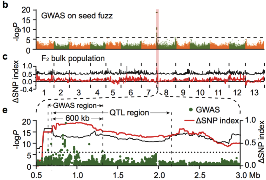 a 亞洲棉種子有絨(左)和無(wú)絨(右)表型;b GWAS關(guān)聯(lián)分析;c F2群體QTL分析;d F2群體的構(gòu)建 e GWAS和QTL聯(lián)合分析