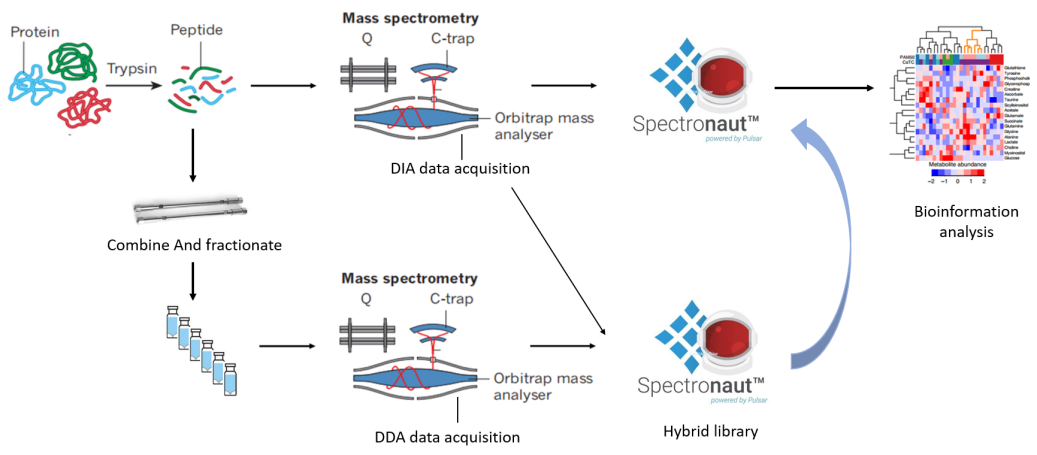 數(shù)據(jù)非依賴性的掃描模式(Date-independent acquisition,DIA)是近幾年發(fā)展的一種新的質(zhì)譜數(shù)據(jù)采集方式??梢詫①|(zhì)譜全掃描分為若干窗口,然后對每個窗口中的所有離子進行檢測、碎裂,從而無遺漏、無差異地獲得樣本中所有離子的信息。目前流行的蛋白質(zhì)組學研究手段,如ITRAQ、TMT、Label free、SILAC采用的都是數(shù)據(jù)依賴掃描模式(Date-dependent acquisition,DDA)。相對于DDA,DIA方法具有重復性好、蛋白覆蓋率高、定量z確度高等特點,適用于大樣本。